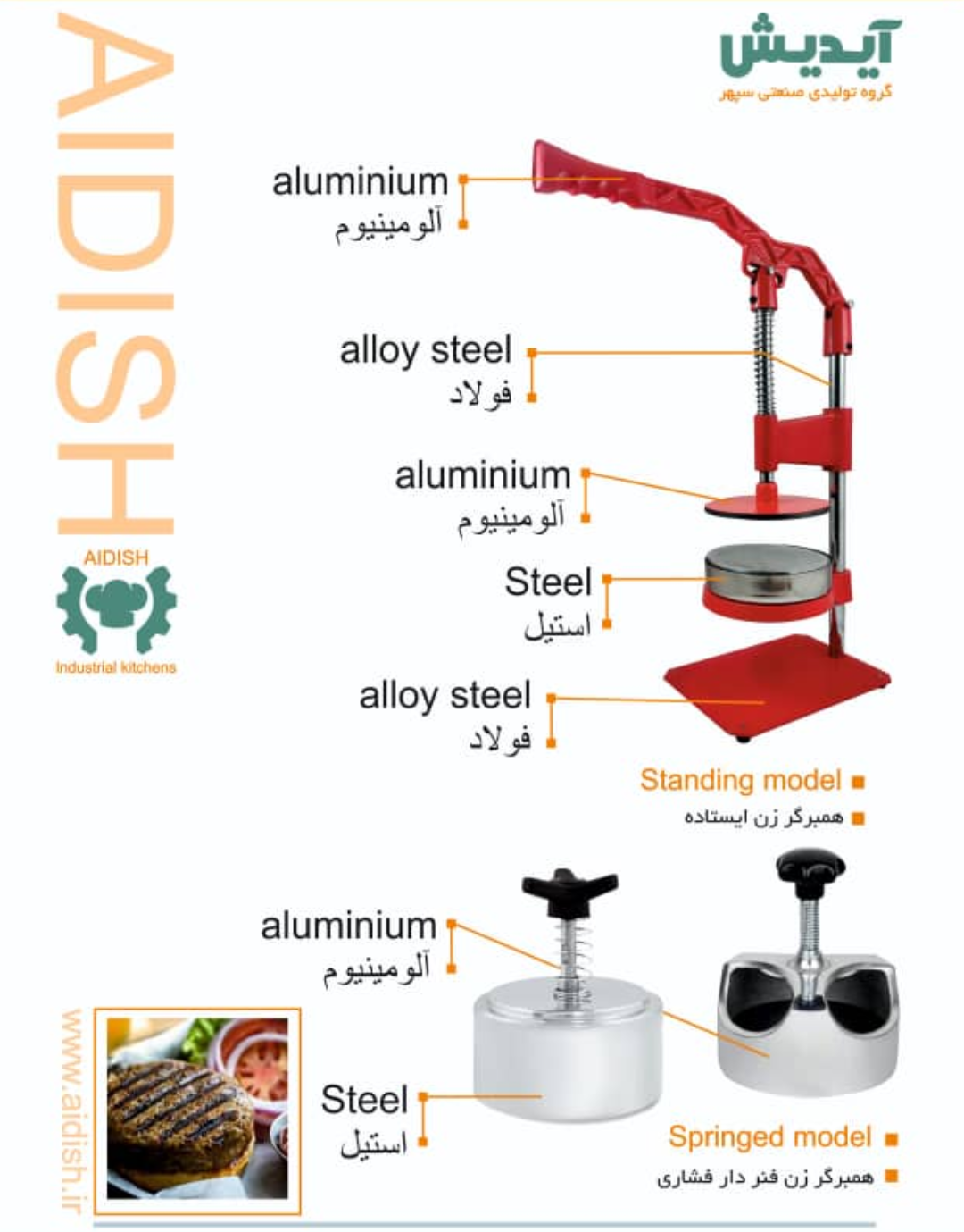 همبرگر زن ایستاده آیدیش یکی از محصولات پرطرفدار شرکت ایرانی آیدیش است. انواع همبرگر زن ایستاده آیدیش به صورت دستی کار میکند. اگر اهل سفر و طبیعت گردی هستید، میتوانید با خرید همبرگر زن ایستاده آیدیش به راحتی در دل طبیعت غذای لذیذ و محبوب خود را تهیه و میل کنید. قیمت همبرگر زن ایستاده آیدیش نسبت به نمونههای مشابه خارجی بسیار ارزان است در حالیکه کیفیت دستگاه همبرگر زن ایستاده آیدیش قابل رقابت با آنها خواهد بود. این دستگاه میتواند ابزار مناسبی برای ساندویچیها، فست فود ها و رستوران ها باشد و نیازهای آنها را در حد یک کسب و کار متوسط برآورده کند.همبرگر زن ایستاده آیدیش دارای یک اهرم در قسمت بالایی دستگاه است همچنین این دستگاه پایههای نصب شده بر روی یک صفحه آهنی دارد که باعث می شود تا دستگاه همبرگر زن دستی آیدیش به راحتی و استحکام بر روی سطوح قرار گیرد. برای درست کردن همبرگر باید بعد از شارژ کردن مخزن دستگاه اهرم را به سمت پایین هدایت کرد تا همبرگر آماده شود. انواع همبرگر زن ایستاده آیدیش از فلزات مقاوم در برابر خوردگی و فرسودگی ساخته شده است.